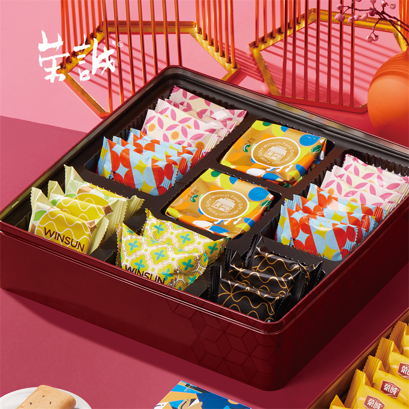 【编 码】 CGT2208 【条形码】 6925755534508 【尺 寸】 29.8x29.8x14.3cm 【净含量】 845g 【规 格】 845gx4盒/箱 【内容物】 100g综合果仁x1,48g樱花荔枝味曲奇x1,30g坚果挞x2,35g特色果仁腐乳饼x2,8g果仁曲奇x8,10g香焙杏仁酥x8,30g香妃凤梨酥x3,30g黑金凤梨酥x3,13.5g澳式金泊鸡蛋卷(咸蛋黄)x9,13.5g澳式金泊鸡蛋卷(芝麻原味)x9