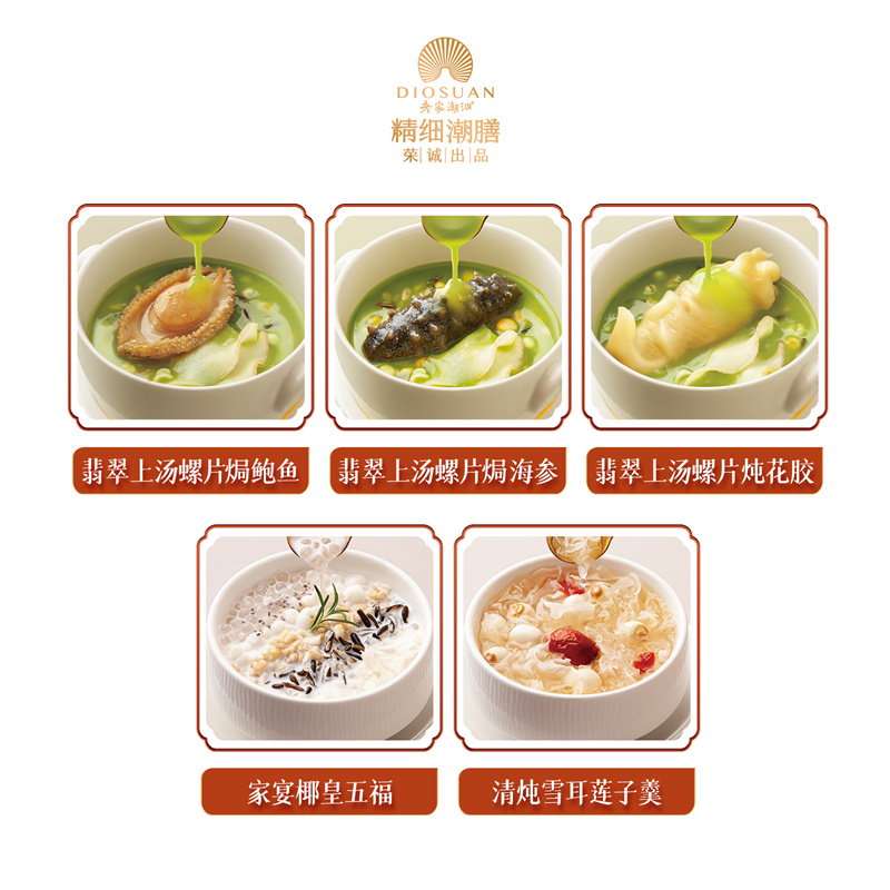 【编 码】 JXCS2412 【条形码】 6925755536113 【尺 寸】 32.5x23.5x16.5cm(泡沫箱尺寸) 【净含量】 1350g 【规 格】 【内容物】 225g翡翠上汤螺片焗鲍鱼x1,225g翡翠上汤螺片焗海参x1,225g翡翠上汤螺片炖花胶x1,225g家宴椰皇五福x1,225g清炖雪耳莲子羹x2